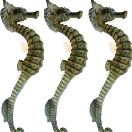 3 small SEAHORSE solid hollow brass door aged old style house PULL handle 10″ outdoor natural oxidized aged bronze patina