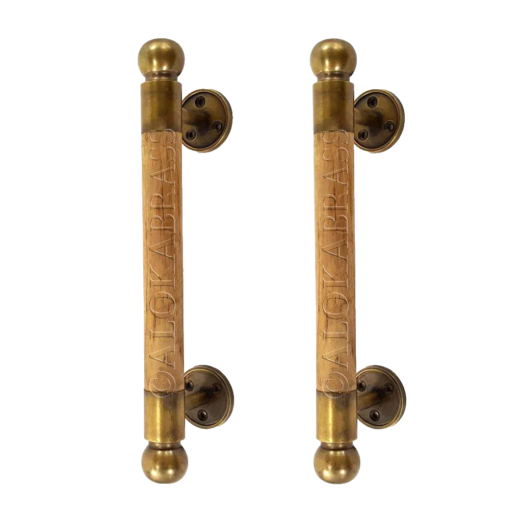2 wooden vintage style door handle pulls with solid brass ends.