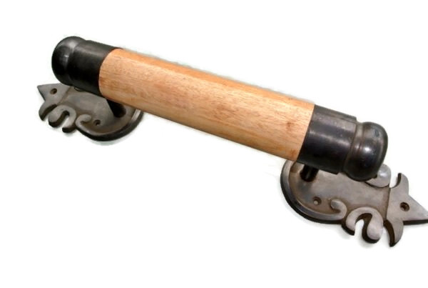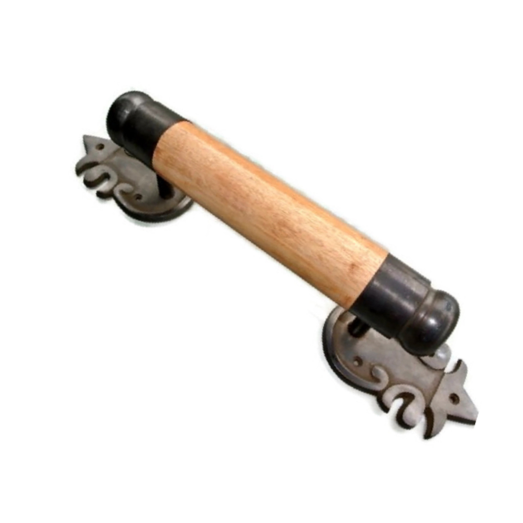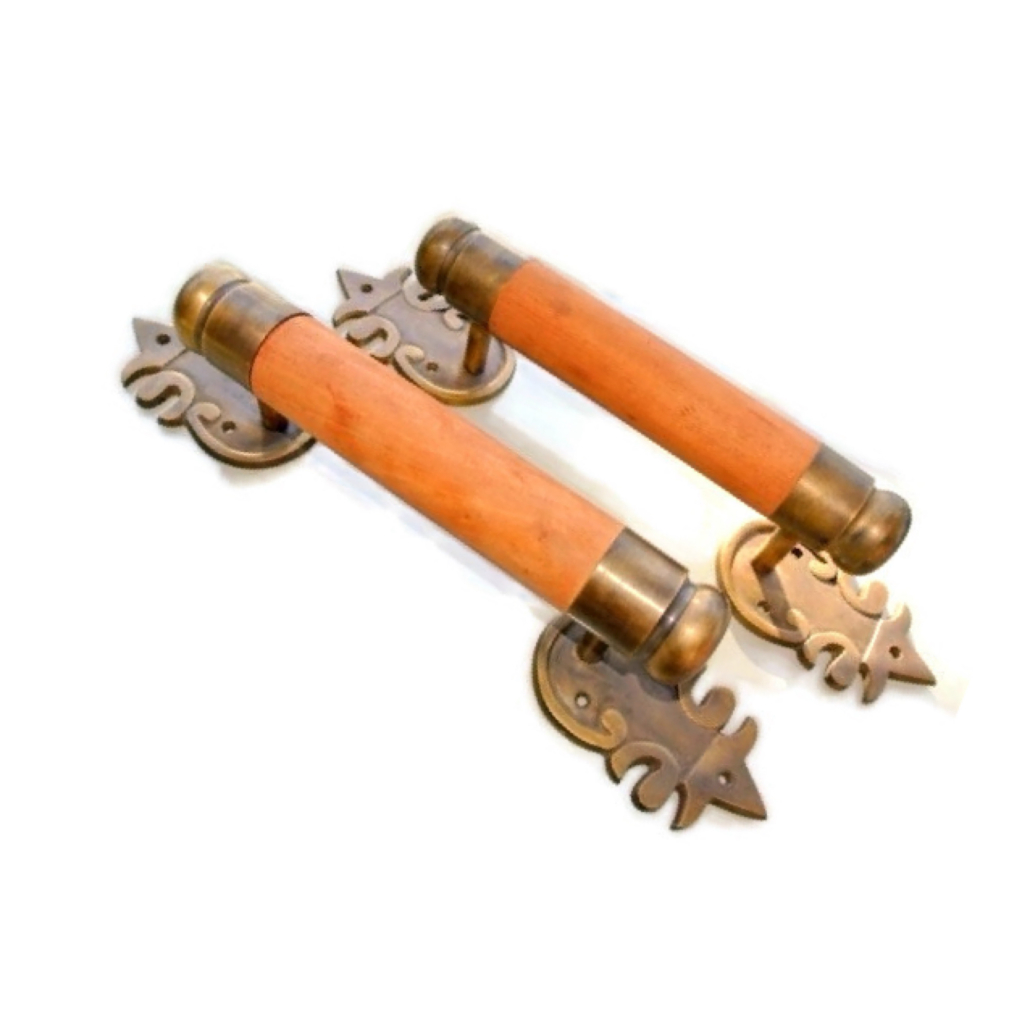 Asian-inspired wooden vintage-style door handle pulls with solid brass ends.