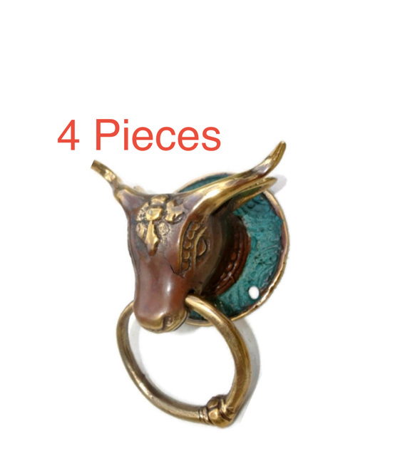 4 small bull head heavy Door handle solid brass vintage antique style ring 7 cm hook Bronze patina