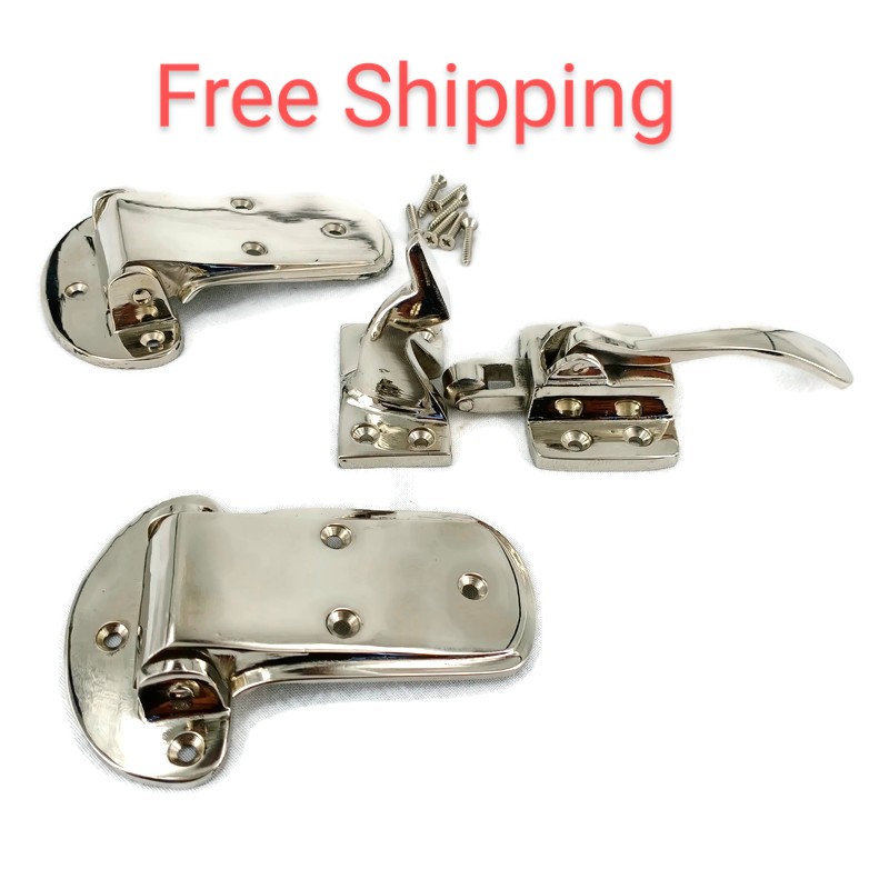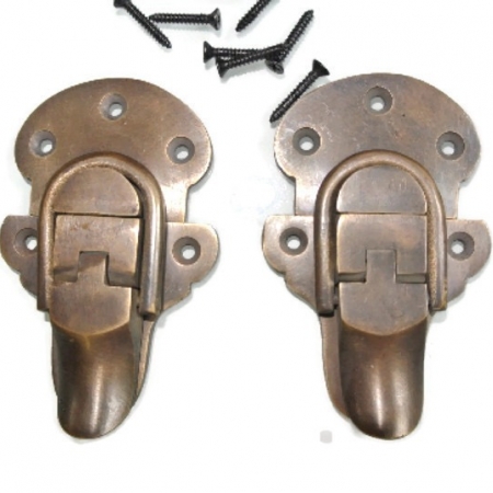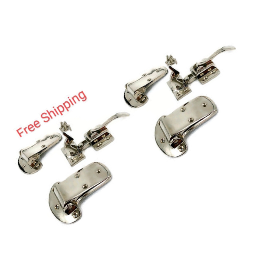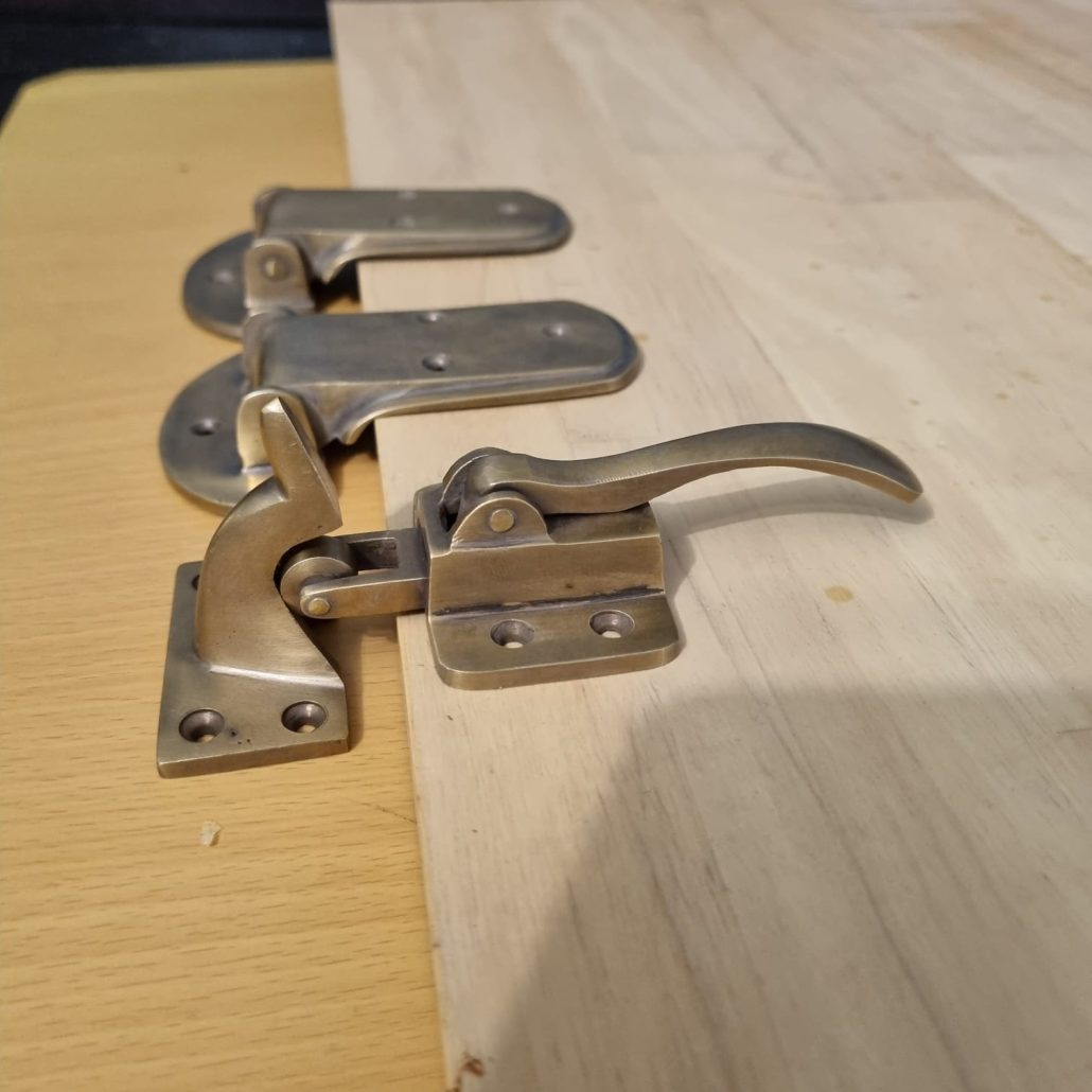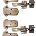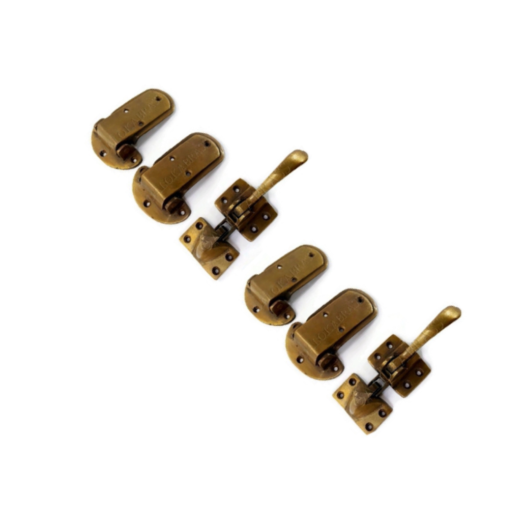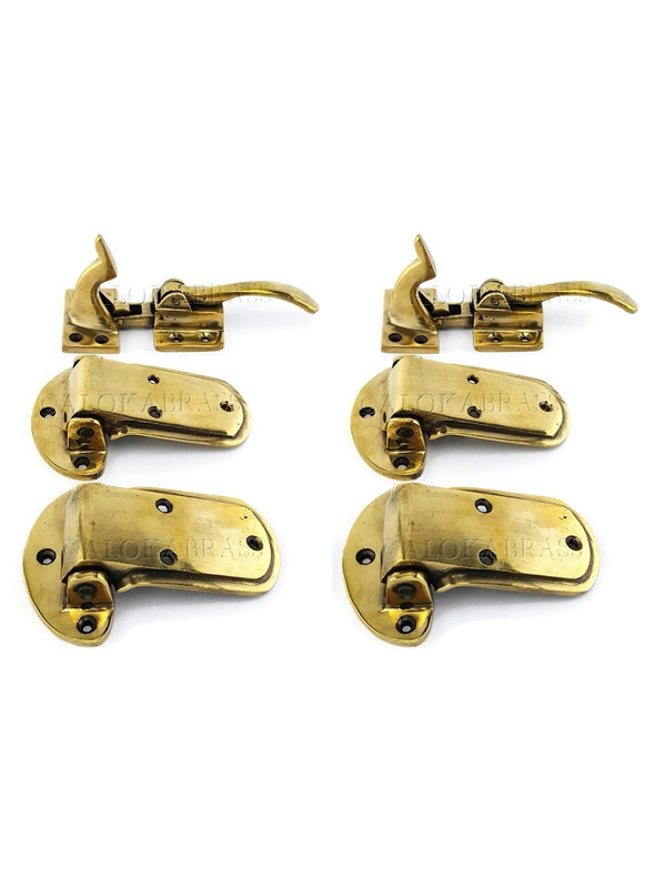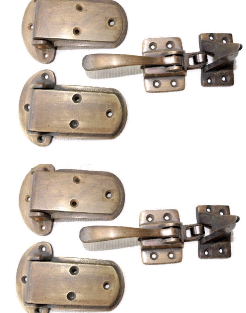2 Pair rare offset 1/2″ inch approx ICE BOX CATCH lever 4 hinges aged style solid Brass lead light heavy offset 4″ left & right hinge antique style vintage