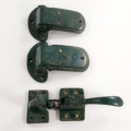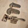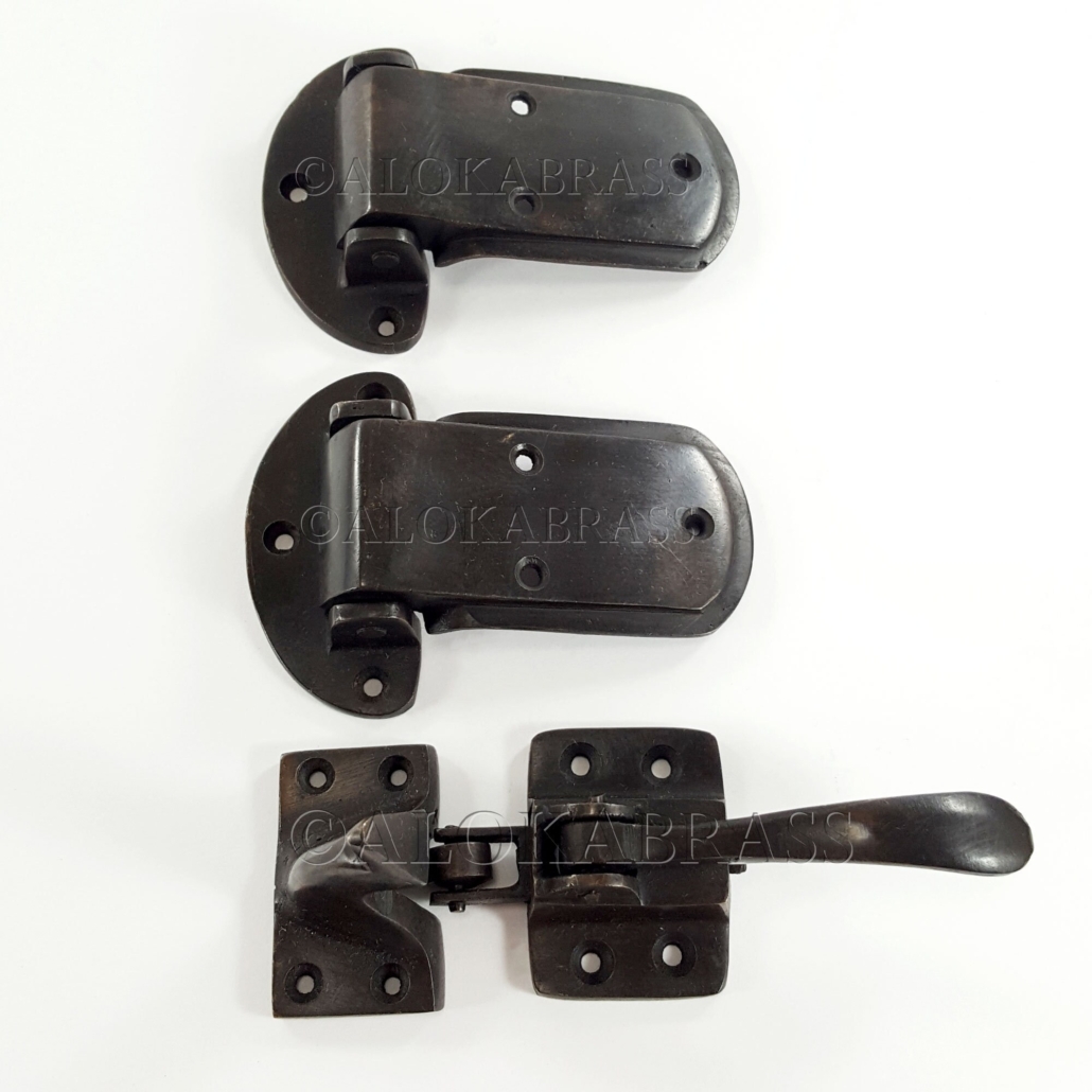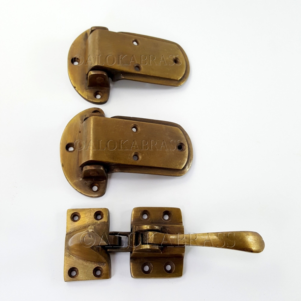 large 3/4″ offset rare brass ICE BOX CATCH lever 2 hinges aged antique style solid pure brass heavy offset 4″ left & right vintage hinges old aged style
